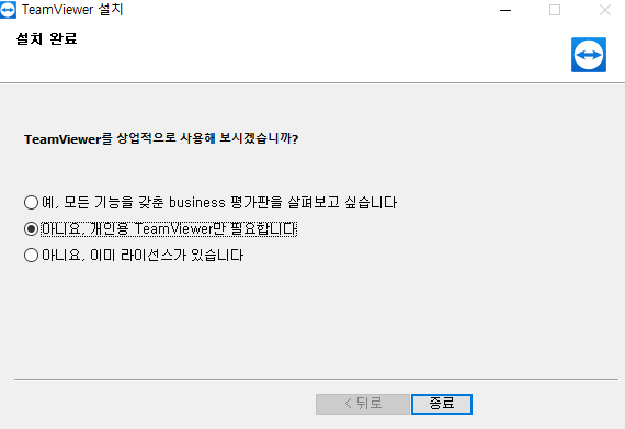 '아니요. 개인용 TeamViewer만 필요합니다' 를 선택해 진행해 주시면 됩니다.