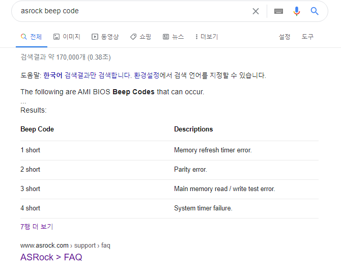 제조사 + beep code 라고 구글에 검색하세요.ex) asrock beep code