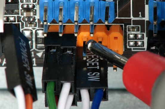 첫 번째로 버튼의 문제인지 확인하는 방법은 매우 간단합니다. 메인보드에서 전원 버튼과 연결되어 있는 2개의 핀이 있는데요. 여기에 컴퓨터 본체 커버에 부착되어 있는 전원 버튼과 연결된 라인을 따라가면, 메인보드에 선이 꼽혀 있을 겁니다. 해당 선을 뽑아 보면 아래 이미지 처럼, 'POWER SW' 또는 'SW' 등으로 써있을 겁니다. 해당 선들을 뽑아 놓고 보면 뽑힌 자리에 두개의 핀이 보일 겁니다. 이 두 개 핀을 드라이버 또는 가위처럼 전기가 흐르고 뾰족한 물건을 이용해 쇼트시켜 주면 됩니다. 서로 전기가 통하도록 연결시켜주는 것입니다.