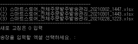 지금은 해당 폴더에 해당 xlsx 파일만 존재하기 때문에 리스트가 한 개만 내오지만 여러 개를 매일 사용하면서 여러 개를 다운로드하면, 아래처럼 xlsx 파일의 개수만큼 리스트에 나옵니다.