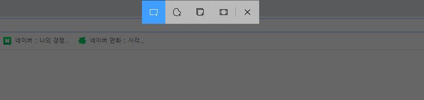 이러한 불편함은 win + shift + s를 이용하면 해결할 수 있습니다. 키보드에서 이 세 가지 키를 누르면, 아래와 같은 이미지가 나오면서 화면이 어두워집니다. 이때 캡처를 원하는 부분을 복사해서 붙여 넣어 주시면 됩니다. 캡처된 이미지를 파일로 저장하려면 마찬가지로 그림판에 붙여 넣어 저장해야 하지만, 카톡, 문서 파일, 블로그 포스팅 시에 대부분