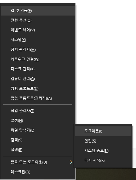 win + x를 누르면 아래와 같은 창이 나온다. 이때, u를 눌러주면, 로그아웃, 절전, 시스템 종료, 다시 시작 등을 확인할 수 있다. 따라서 win + x, u, u를 차례로 빠르게 눌러주면, 어떤 화면에서도 컴퓨터가 종료 모드로 진입하는 것을 확인할 수 있다. alt + F4를 사용할 때는 종료와 재시작만 가능 하지만 win + x , u를 이용하면 로그아웃과 절전 모드도 편리하게 사용할 수 있다. 절전모드를 단축키로 진입하기 위해서 알아본 방법이지만, 이 방법을 알게 된 이후로는 alt + F4는 사용하지 않는다. 업무용 컴퓨터를 사용하다가 자리를 비울 때마 보안을 위해 화면을 꺼야 한다면, 단축키로 절전모드를 이용하면 편리하다. 또한 해당 단축키로 컴퓨터를 재부팅하거나, 끄면 왠지 전문성이 있어 보이는 느낌이 든다.
