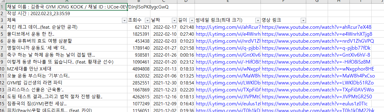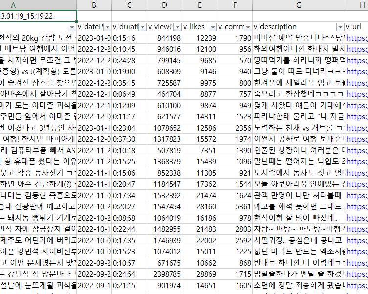 1. 유튜브 채널의 주소(url)을 입력하면, 해당 채널에 업로드 된 모든 채널의 정보를 수집합니다. . 2. 이후 수집된 데이터를 xlsx(엑셀), json, html, csv 등으로 저장합니다. 1. v_name : 영상 이름 2. v_datePu